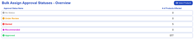 When you enter the Bulk Assign Approval Statuses page, you will see an overview of all approval statuses in your organization, as well as the number of products that given status is associated to in the system.