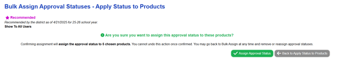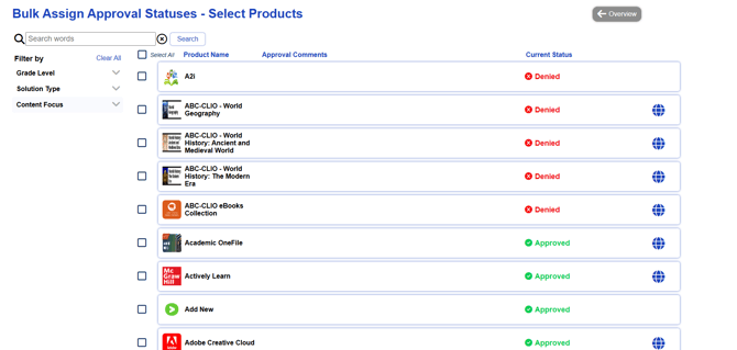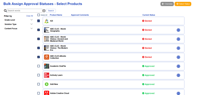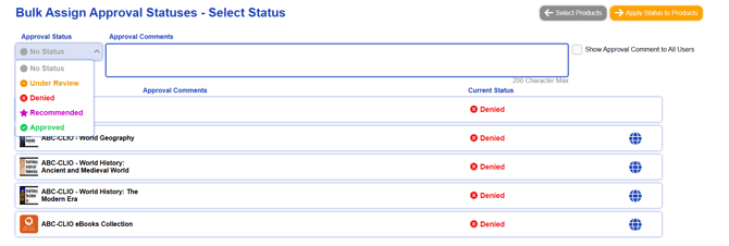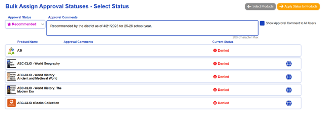 Users who can edit the product profiles have the ability to assign approval statuses, telling your staff and students which products are meant for use. Approval statuses can be managed in bulk, providing a way to quickly mark many products with the same status and comment