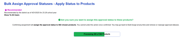 Please note that if you are attempting to assign a status from an extensive number of products, you will see a processing screen. This is an indicator that the assignment is working, but may take a few more moments.