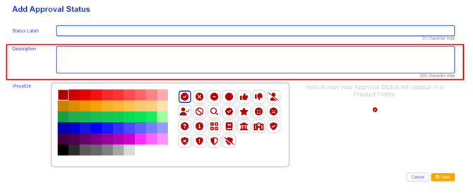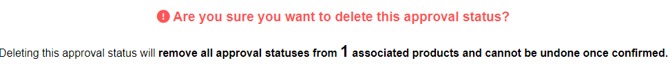 Users may delete an approval status at any time. When an approval status is deleted, products with that assigned status will revert back to "No Status". Users are warned how many products will be affected before they confirm deletion.